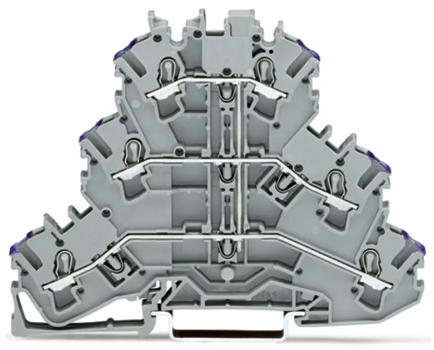 złączka 3-piętrowa; złączka przelotowa 6-przewodowa; L; bez podstawki oznacznika; do zastosowań Ex e II; z mostkowaniem wewnętrznym; otwory na przewody z fiolet. nadrukiem; na szynę TS 35 x 15 i 35 x 7,5; 2,5 mm²; Push-in CAGE CLAMP®; 2,50 mm²; szary