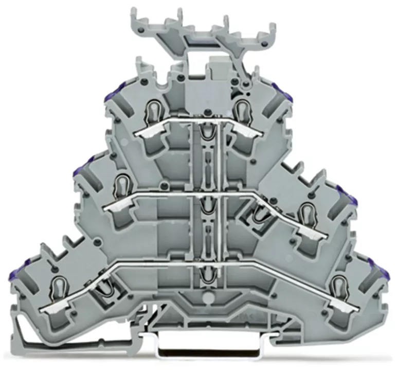 złączka 3-piętrowa; złączka przelotowa 6-przewodowa; L; z podstawką oznacznika; do zastosowań Ex e II; z mostkowaniem wewnętrznym; otwory na przewody z fiolet. nadrukiem; na szynę TS 35 x 15 i 35 x 7,5; 2,5 mm²; Push-in CAGE CLAMP®; 2,50 mm²; szary