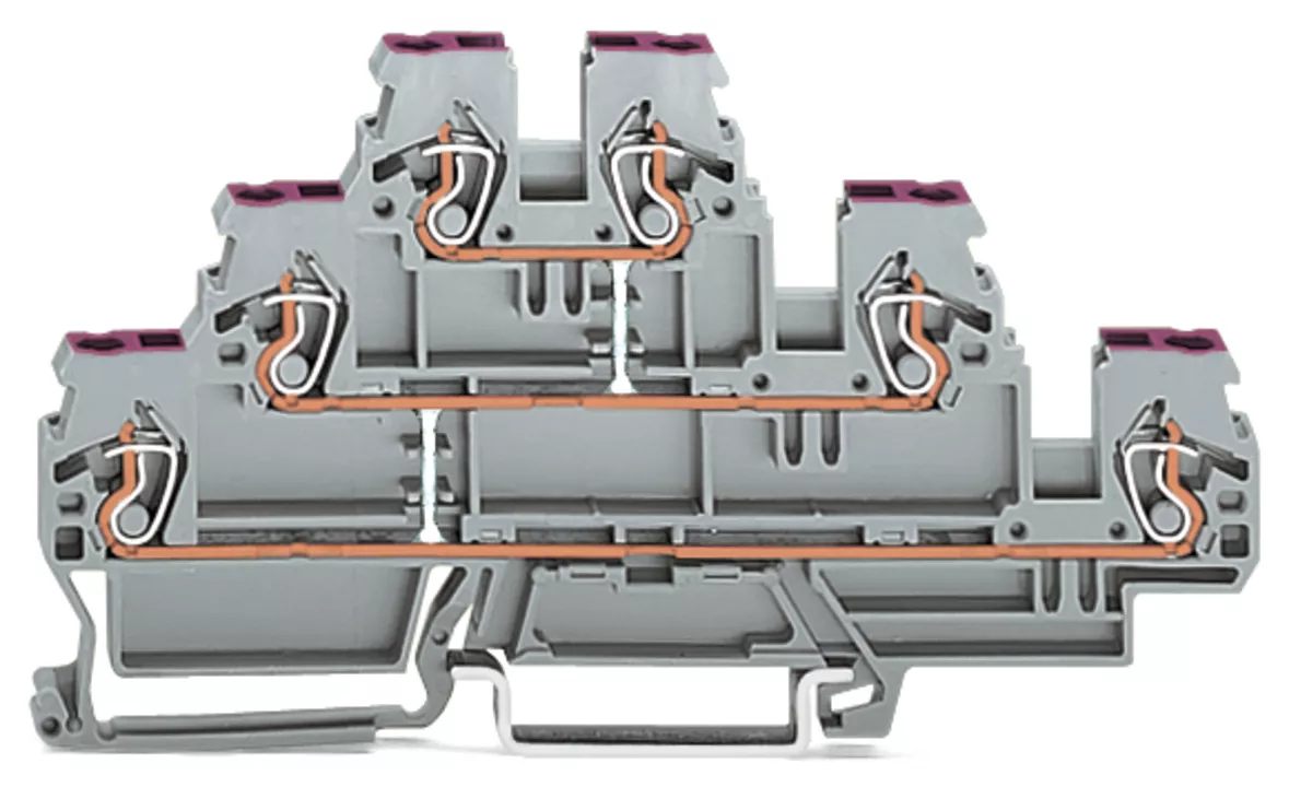 złączka 3-piętrowa; złączka przelotowa 6-przewodowa; L; z mostkowaniem wewnętrznym; otwory na przewody z fiolet. nadrukiem; na szynę TS 35 x 15 i 35 x 7,5; 2,5 mm²; CAGE CLAMP®; 2,50 mm²; szary