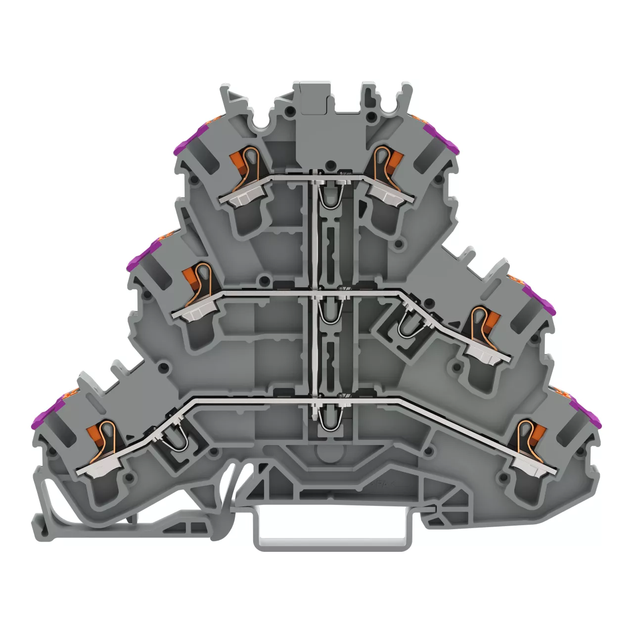 złączka 3-piętrowa; z przyciskami; złączka przelotowa 6-przewodowa; L; bez podstawki oznacznika; do zastosowań Ex e II; z mostkowaniem wewnętrznym; otwory na przewody z fiolet. nadrukiem; na szynę TS 35 x 15 i 35 x 7,5; 2,5 mm²; Push-in CAGE CLAMP®; 2,50 mm²; szary