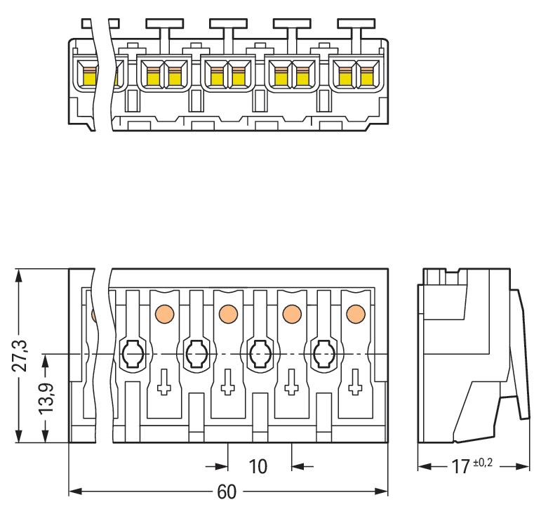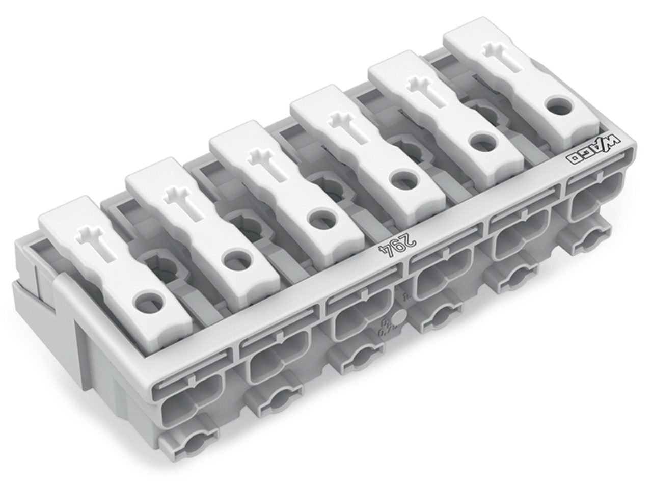 złączka zasilająca; przyciski: od strony zewn.; bez styku PE; 6-bieg.; od strony oprawy: do przew. jednodr.; od strony inst.: do wsz. rodz. przewodów; maks. 2,5 mm²; temperatura otoczenia maks. 85°C (T85); biały