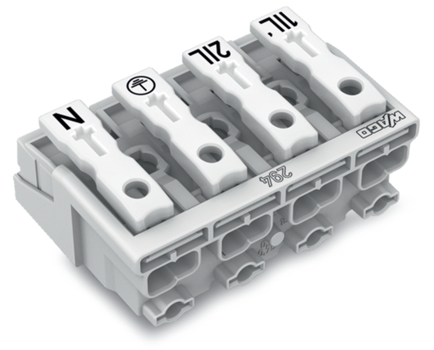 złączka zasilająca; przyciski: od strony zewn.; bez styku PE; 1/L-2/L-PE-N; 4-bieg.; od strony oprawy: do przew. jednodr.; od strony inst.: do wsz. rodz. przewodów; maks. 2,5 mm²; temperatura otoczenia maks. 85°C (T85); biały
