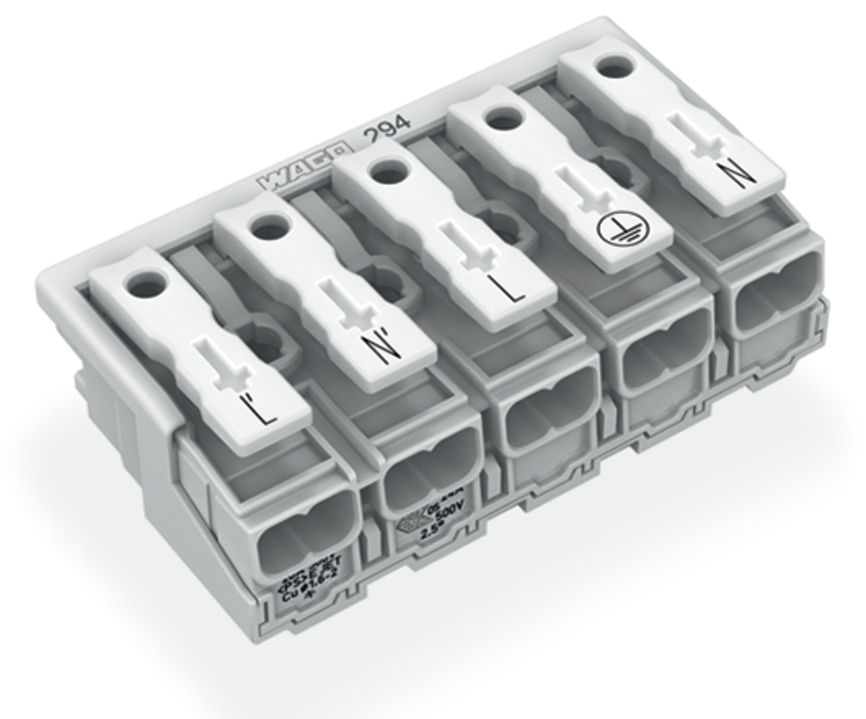 złączka zasilająca; przyciski: od strony zewn.; bez styku PE; L-N-L-PE-N; 5-bieg.; od strony oprawy: do przew. jednodr.; od strony inst.: do wsz. rodz. przewodów; maks. 2,5 mm²; temperatura otoczenia maks. 85°C (T85); biały