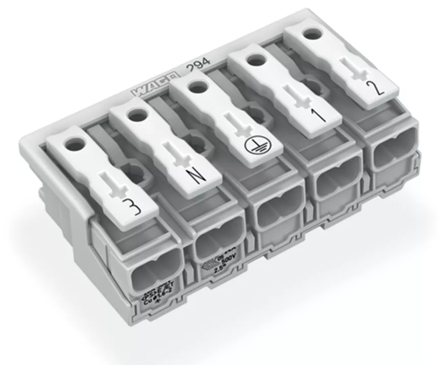 złączka zasilająca; przyciski: od strony zewn.; bez styku PE; 5-bieg.; od strony oprawy: do przew. jednodr.; od strony inst.: do wsz. rodz. przewodów; maks. 2,5 mm²; temperatura otoczenia maks. 85°C (T85); biały