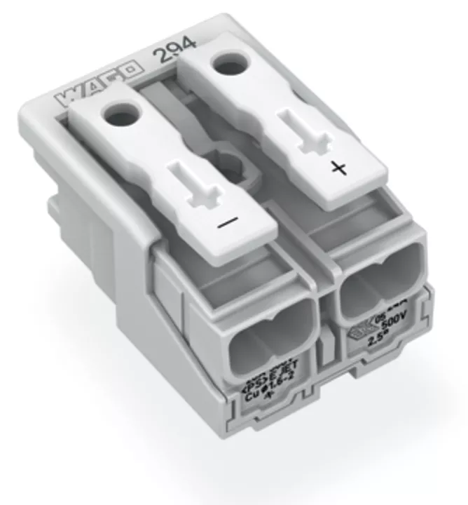 złączka zasilająca; przyciski: od strony zewn.; bez styku PE; 2-bieg.; od strony oprawy: do przew. jednodr.; od strony inst.: do wsz. rodz. przewodów; maks. 2,5 mm²; temperatura otoczenia maks. 85°C (T85); biały