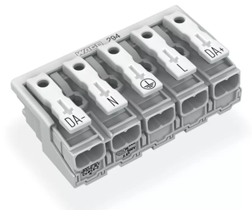 złączka zasilająca; przyciski: od strony zewn.; bez styku PE; 5-bieg.; od strony oprawy: do przew. jednodr.; od strony inst.: do wsz. rodz. przewodów; maks. 2,5 mm²; temperatura otoczenia maks. 85°C (T85); biały