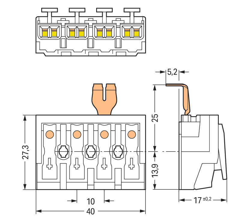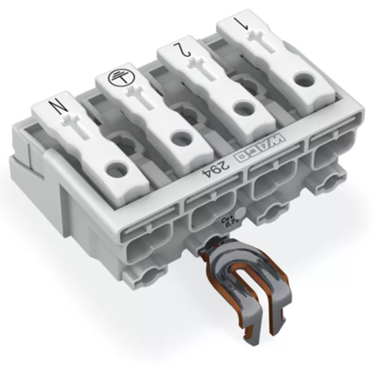 złączka zasilająca; przyciski: od strony zewn.; z zatrzaskowym stykiem PE; 4-bieg.; od strony oprawy: do przew. jednodr.; od strony inst.: do wsz. rodz. przewodów; maks. 2,5 mm²; temperatura otoczenia maks. 85°C (T85); biały