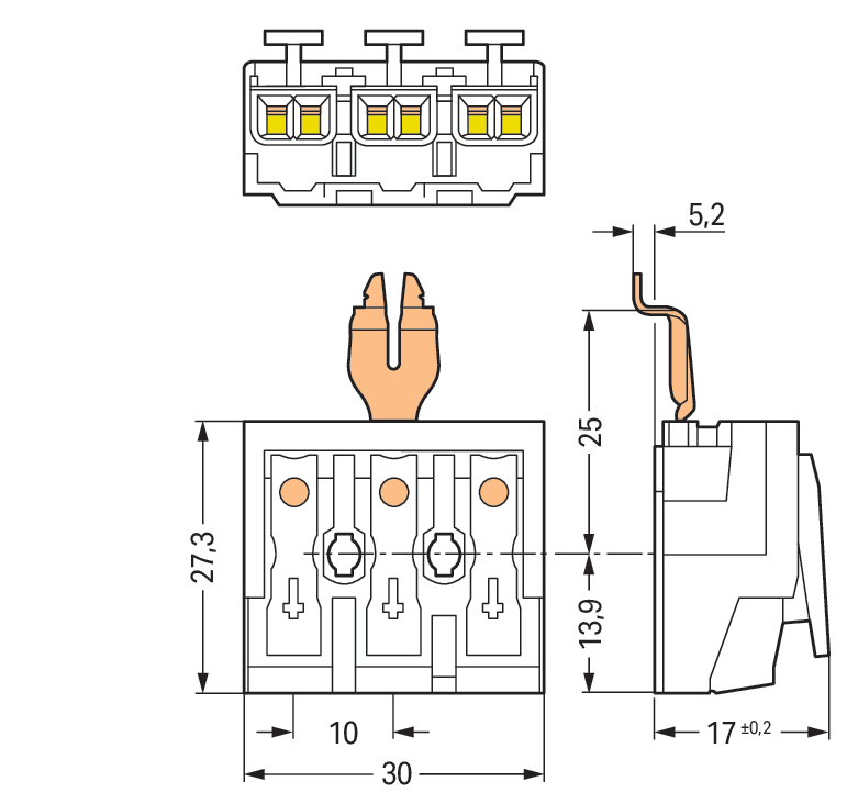 złączka zasilająca; przyciski: od strony zewn.; z kątowym stykiem zatrzaskowym PE; N-PE-L; 3-bieg.; od strony oprawy: do przew. jednodr.; od strony inst.: do wsz. rodz. przewodów; maks. 2,5 mm²; temperatura otoczenia maks. 85°C (T85); biały