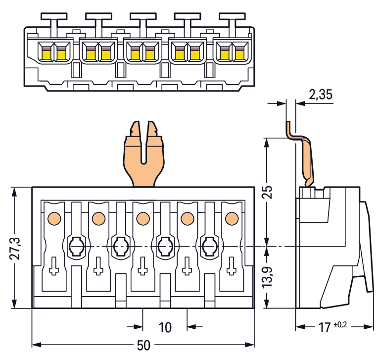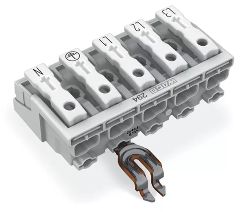złączka zasilająca; przyciski: od strony zewn.; z kątowym stykiem zatrzaskowym PE; L3-L2-L1-PE-N; 5-bieg.; od strony oprawy: do przew. jednodr.; od strony inst.: do wsz. rodz. przewodów; maks. 2,5 mm²; temperatura otoczenia maks. 85°C (T85); biały