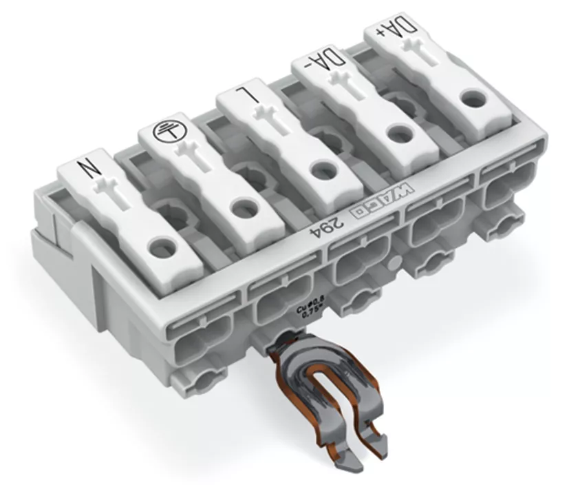 złączka zasilająca; przyciski: od strony zewn.; z kątowym stykiem zatrzaskowym PE; DA+ DA- L PE N; 5-bieg.; od strony oprawy: do przew. jednodr.; od strony inst.: do wsz. rodz. przewodów; maks. 2,5 mm²; temperatura otoczenia maks. 85°C (T85); biały