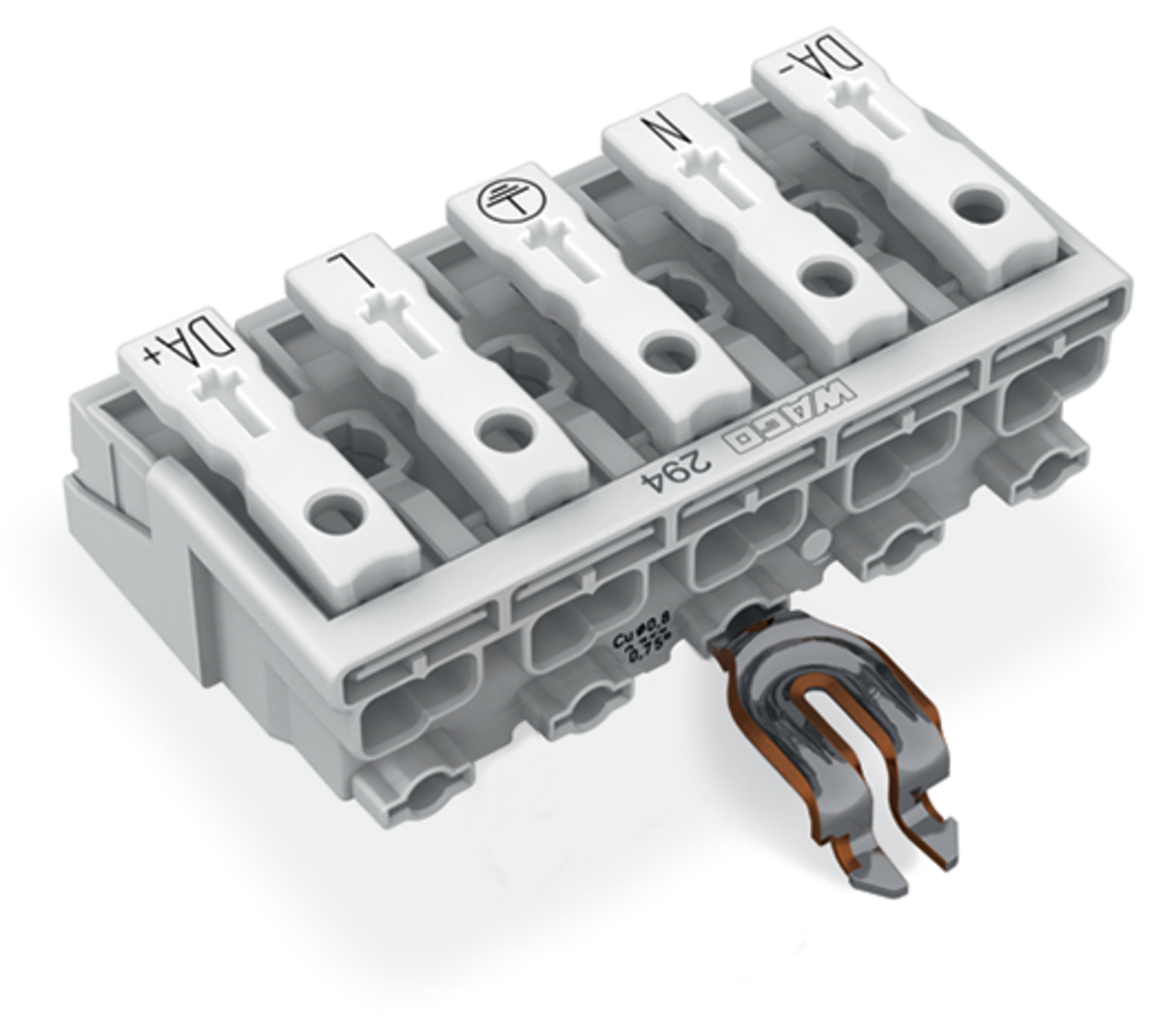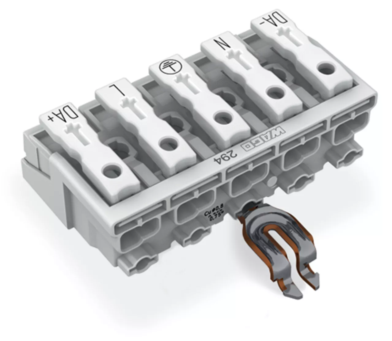 złączka zasilająca; przyciski: od strony zewn.; z kątowym stykiem zatrzaskowym PE; 5-bieg.; od strony oprawy: do przew. jednodr.; od strony inst.: do wsz. rodz. przewodów; maks. 2,5 mm²; temperatura otoczenia maks. 85°C (T85); biały