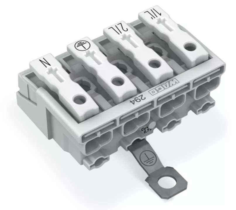złączka zasilająca; przyciski: od strony zewn.; ze śrubowym stykiem PE; 4-bieg.; od strony oprawy: do przew. jednodr.; od strony inst.: do wsz. rodz. przewodów; maks. 2,5 mm²; temperatura otoczenia maks. 85°C (T85); biały