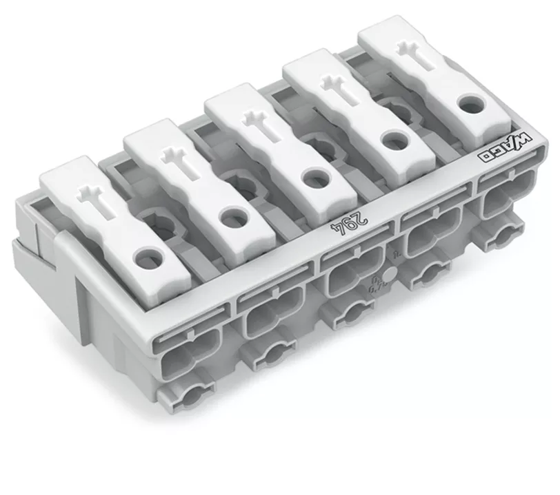 złączka zasilająca; przyciski: od strony zewn.; bez styku PE; 5-bieg.; od strony oprawy: do przew. jednodr.; od strony inst.: do wsz. rodz. przewodów; maks. 2,5 mm²; temperatura otoczenia maks. 85°C (T85); biały