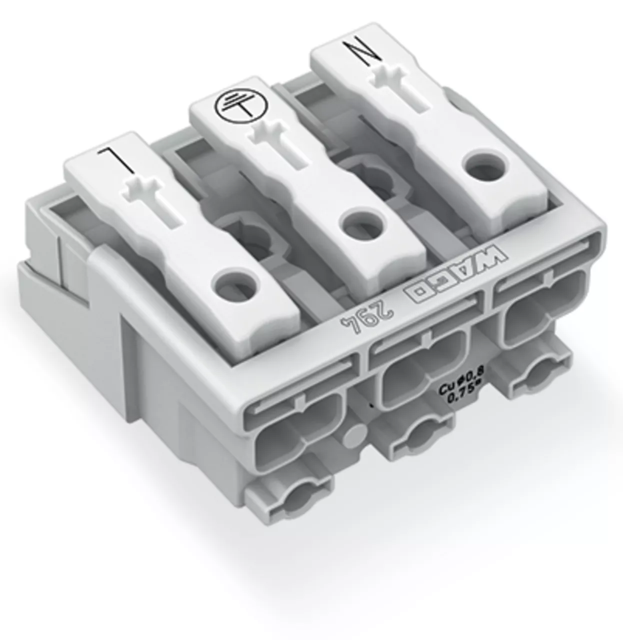 złączka zasilająca; przyciski: od strony zewn.; bez styku PE; N-PE-L; 3-bieg.; od strony oprawy: do przew. jednodr.; od strony inst.: do wsz. rodz. przewodów; maks. 2,5 mm²; temperatura otoczenia maks. 85°C (T85); biały