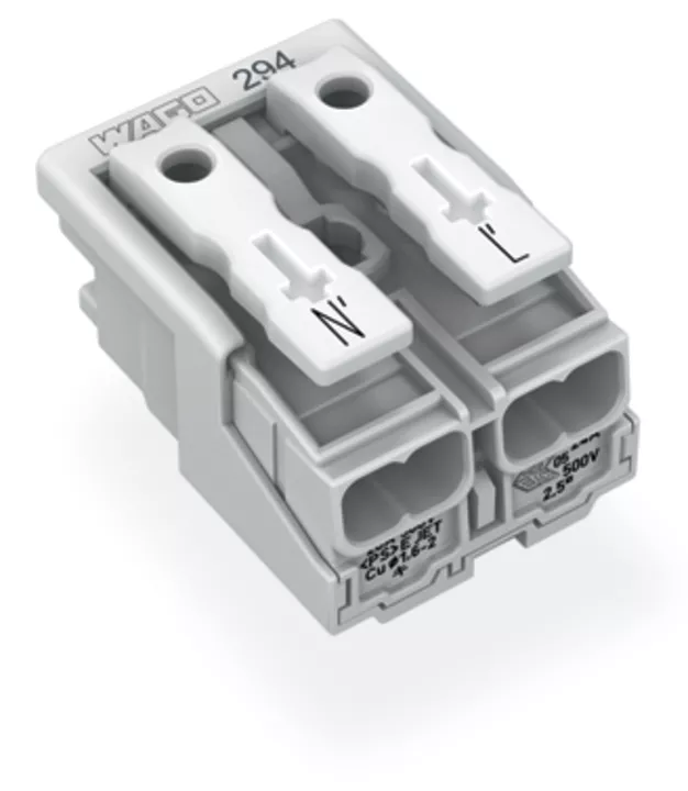 złączka zasilająca; przyciski: od strony zewn.; bez styku PE; N-L; 2-bieg.; od strony oprawy: do przew. jednodr.; od strony inst.: do wsz. rodz. przewodów; maks. 2,5 mm²; temperatura otoczenia maks. 85°C (T85); biały