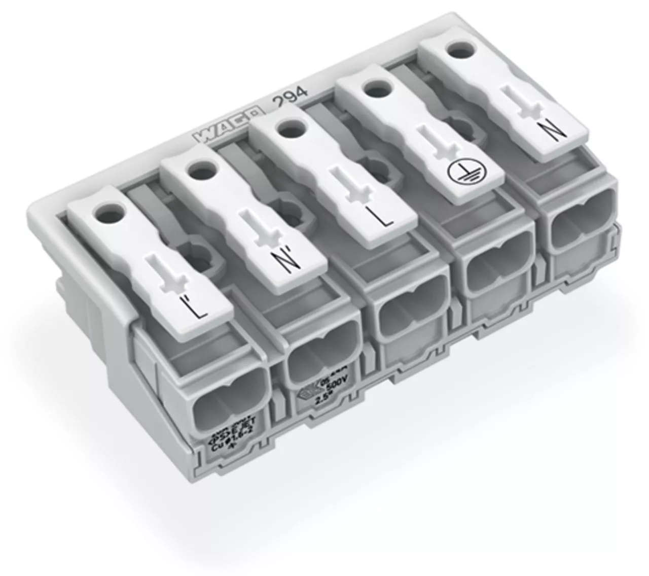 złączka zasilająca; przyciski: od strony zewn.; bez styku PE; L-N-L-PE-N; 5-bieg.; od strony oprawy: do przew. jednodr.; od strony inst.: do wsz. rodz. przewodów; maks. 2,5 mm²; temperatura otoczenia maks. 85°C (T85); biały