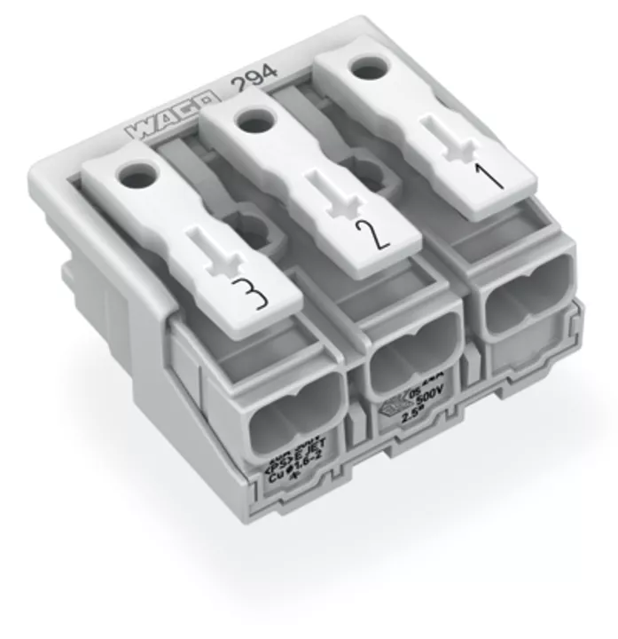 złączka zasilająca; przyciski: od strony zewn.; bez styku PE; 3-bieg.; od strony oprawy: do przew. jednodr.; od strony inst.: do wsz. rodz. przewodów; maks. 2,5 mm²; temperatura otoczenia maks. 85°C (T85); biały