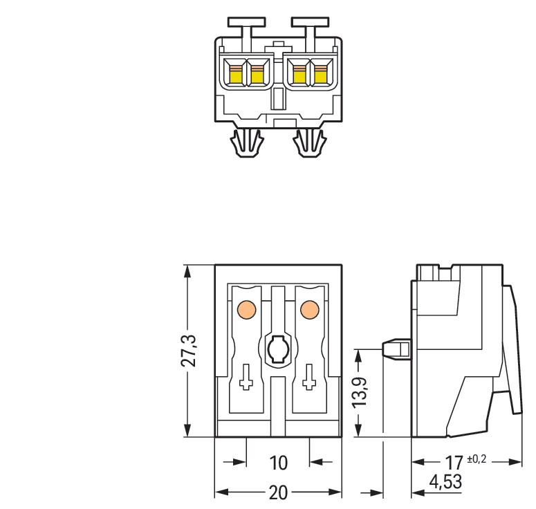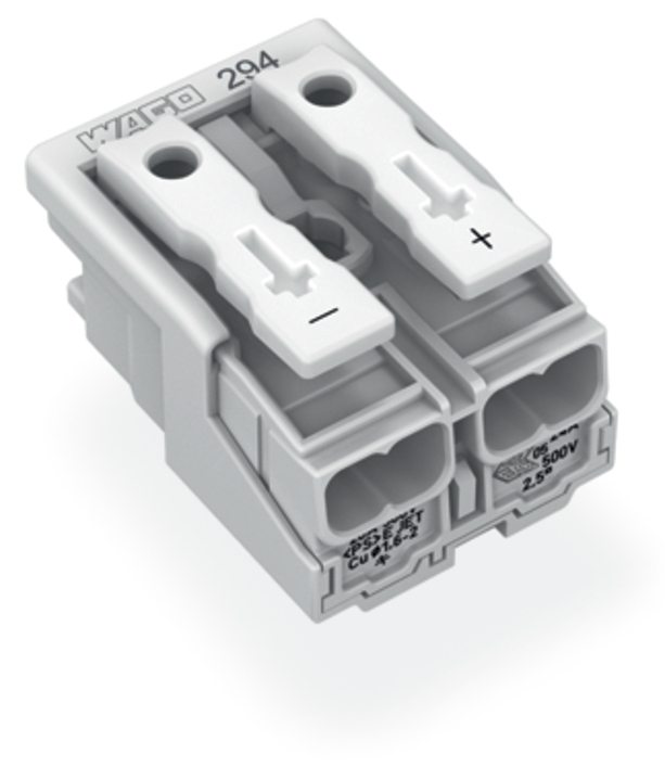 złączka zasilająca; przyciski: od strony zewn.; bez styku PE; 2-bieg.; od strony oprawy: do przew. jednodr.; od strony inst.: do wsz. rodz. przewodów; maks. 2,5 mm²; temperatura otoczenia maks. 85°C (T85); biały