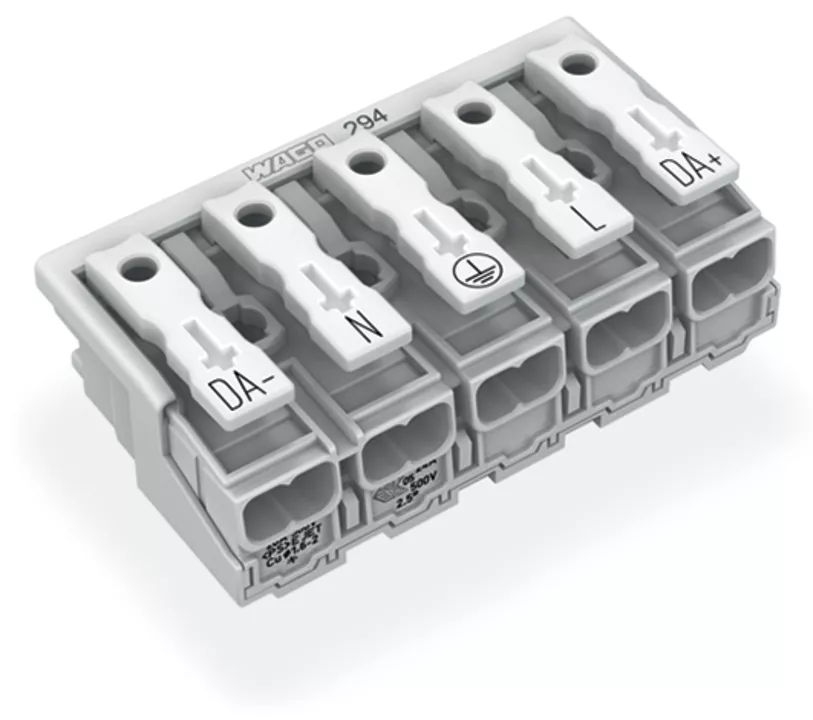 złączka zasilająca; przyciski: od strony zewn.; bez styku PE; 5-bieg.; od strony oprawy: do przew. jednodr.; od strony inst.: do wsz. rodz. przewodów; maks. 2,5 mm²; temperatura otoczenia maks. 85°C (T85); biały