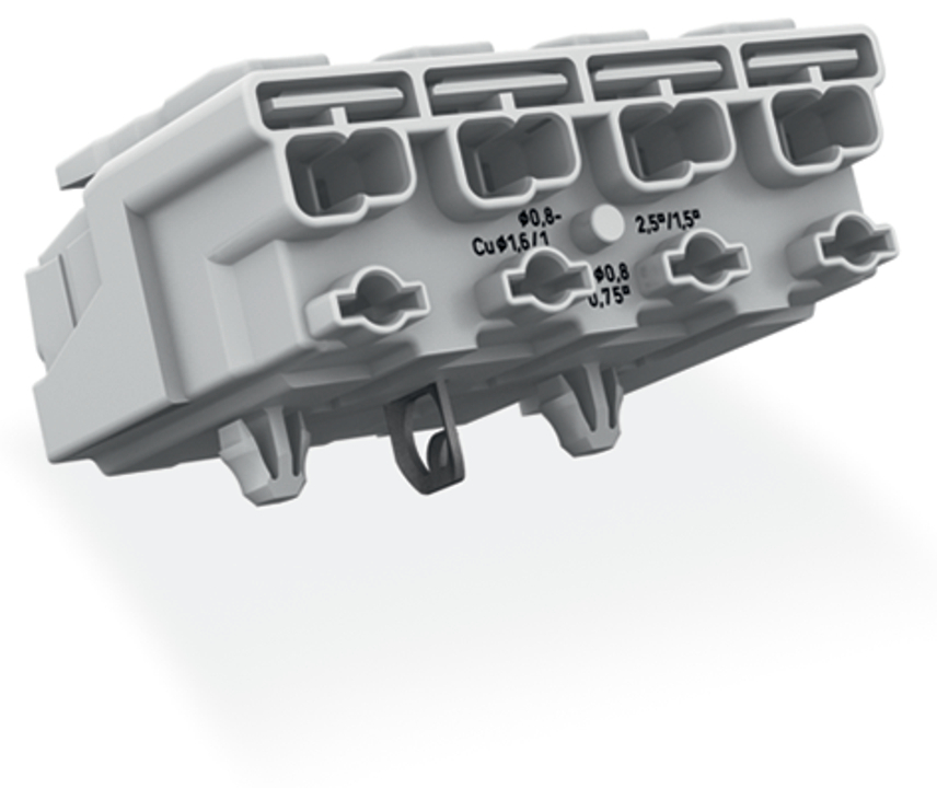 złączka zasilająca; przyciski: od strony zewn.; z bezpośrednim stykiem PE; 4-bieg.; od strony oprawy: do przew. jednodr.; od strony inst.: do wsz. rodz. przewodów; maks. 2,5 mm²; temperatura otoczenia maks. 85°C (T85); biały