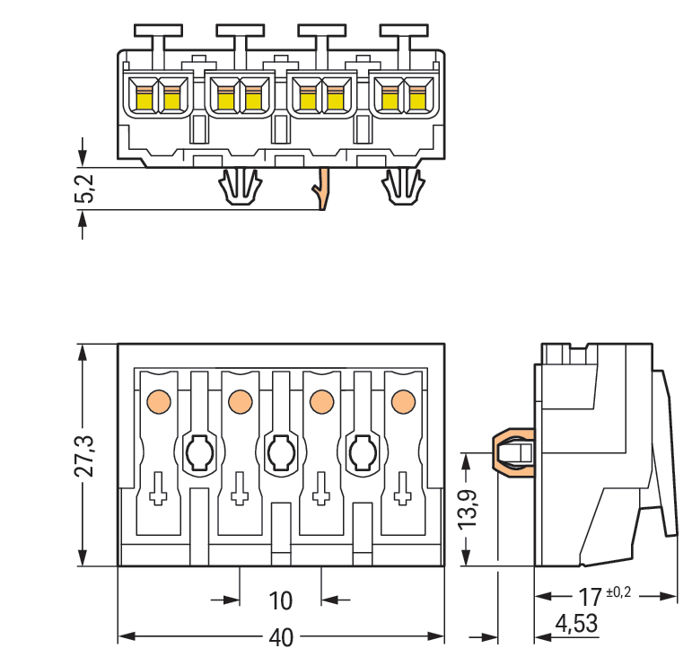 złączka zasilająca; przyciski: od strony zewn.; z bezpośrednim stykiem PE; 1/L-2/L-PE-N; 4-bieg.; od strony oprawy: do przew. jednodr.; od strony inst.: do wsz. rodz. przewodów; maks. 2,5 mm²; temperatura otoczenia maks. 85°C (T85); biały