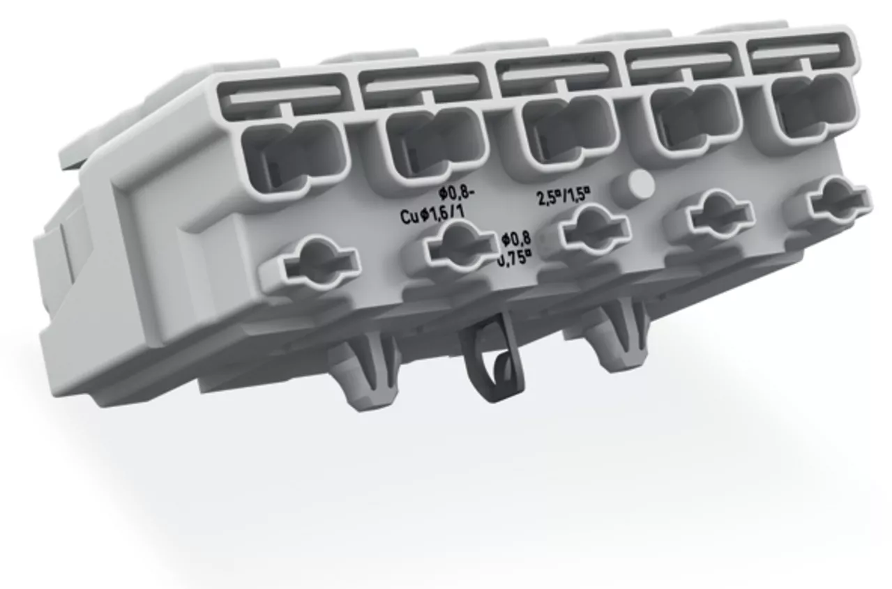 złączka zasilająca; przyciski: od strony zewn.; z bezpośrednim stykiem PE; 5-bieg.; od strony oprawy: do przew. jednodr.; od strony inst.: do wsz. rodz. przewodów; maks. 2,5 mm²; temperatura otoczenia maks. 85°C (T85); biały