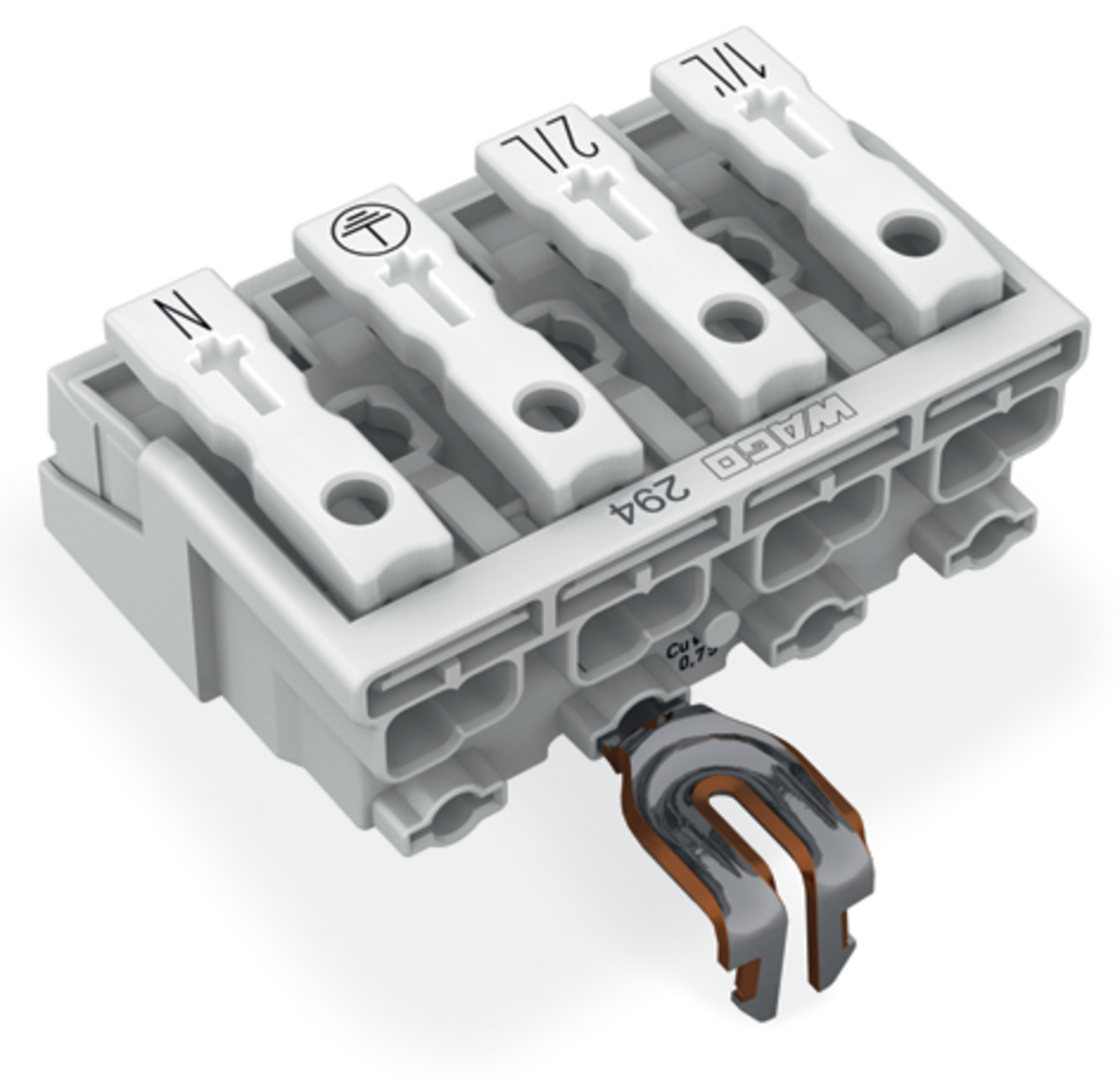 złączka zasilająca; przyciski: od strony zewn.; z zatrzaskowym stykiem PE; 1/L-2/L-PE-N; 4-bieg.; od strony oprawy: do przew. jednodr.; od strony inst.: do wsz. rodz. przewodów; maks. 2,5 mm²; temperatura otoczenia maks. 85°C (T85); biały