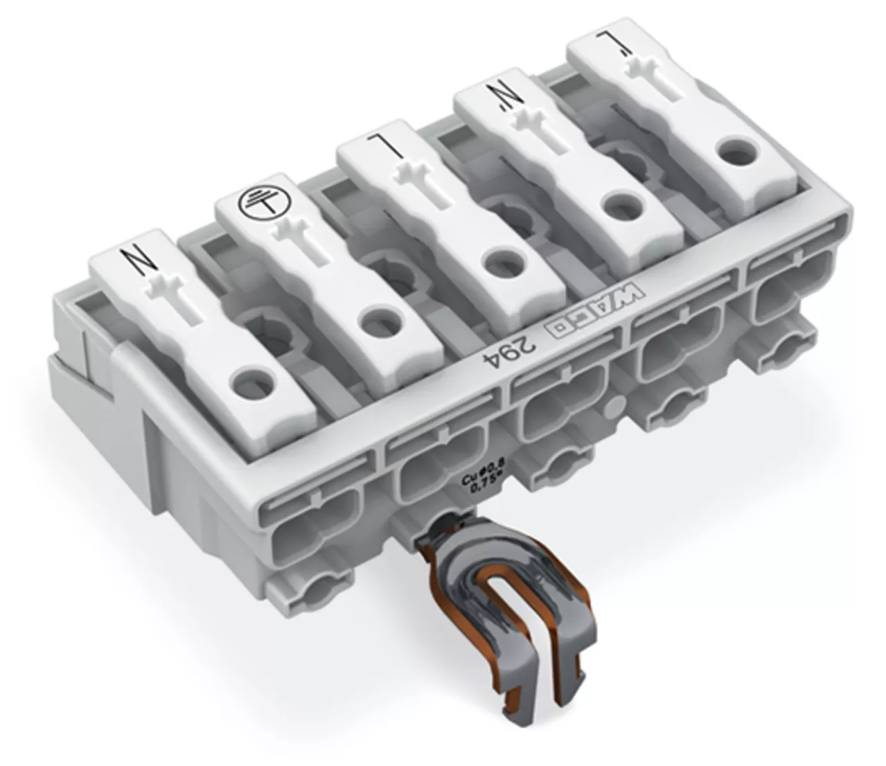 złączka zasilająca; przyciski: od strony zewn.; z zatrzaskowym stykiem PE; L-N-L-PE-N; 5-bieg.; od strony oprawy: do przew. jednodr.; od strony inst.: do wsz. rodz. przewodów; maks. 2,5 mm²; temperatura otoczenia maks. 85°C (T85); biały