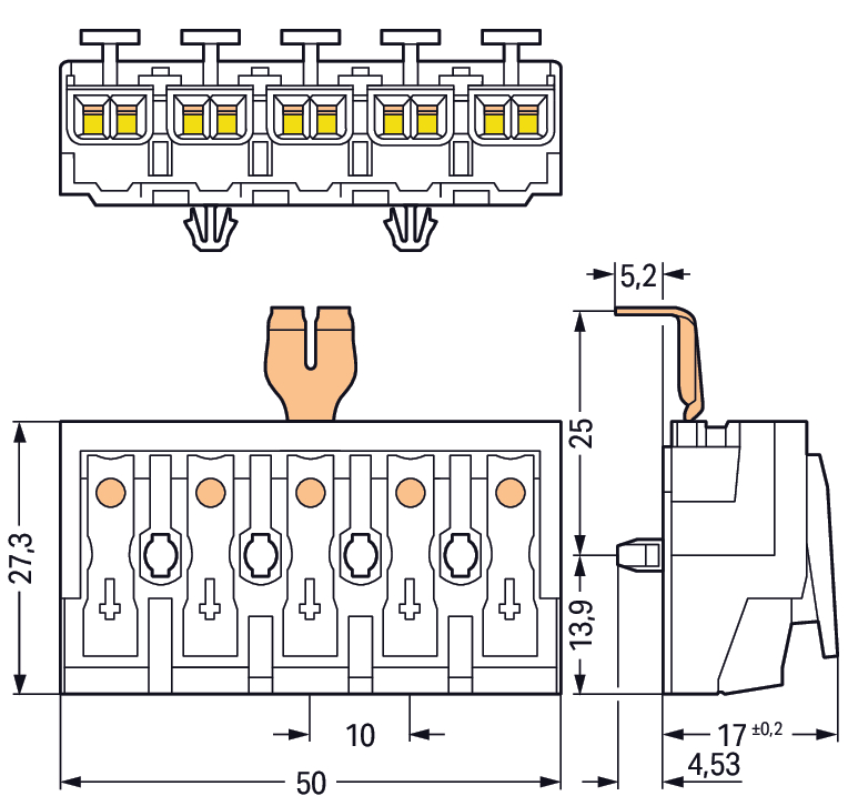 złączka zasilająca; przyciski: od strony zewn.; z zatrzaskowym stykiem PE; 5-bieg.; od strony oprawy: do przew. jednodr.; od strony inst.: do wsz. rodz. przewodów; maks. 2,5 mm²; temperatura otoczenia maks. 85°C (T85); biały
