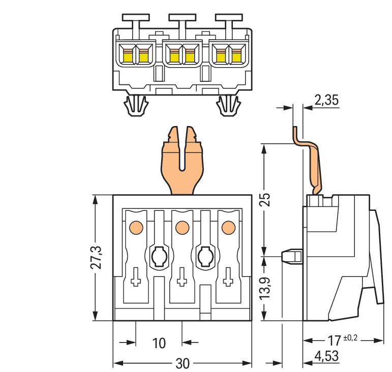 złączka zasilająca; przyciski: od strony zewn.; z kątowym stykiem zatrzaskowym PE; N-PE-L; 3-bieg.; od strony oprawy: do przew. jednodr.; od strony inst.: do wsz. rodz. przewodów; maks. 2,5 mm²; temperatura otoczenia maks. 85°C (T85); biały