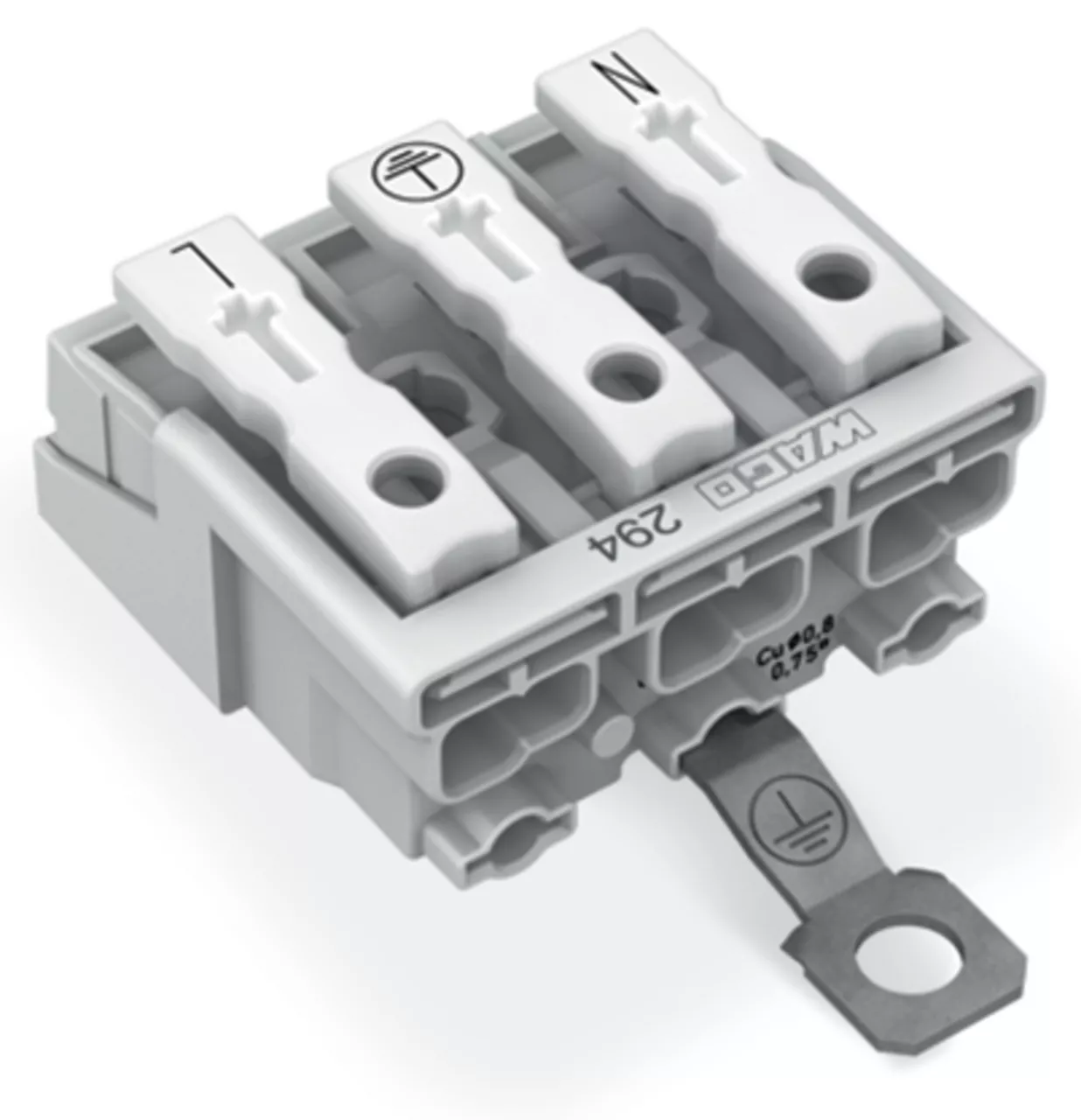 złączka zasilająca; przyciski: od strony zewn.; ze śrubowym stykiem PE; N-PE-L; 3-bieg.; od strony oprawy: do przew. jednodr.; od strony inst.: do wsz. rodz. przewodów; maks. 2,5 mm²; temperatura otoczenia maks. 85°C (T85); biały