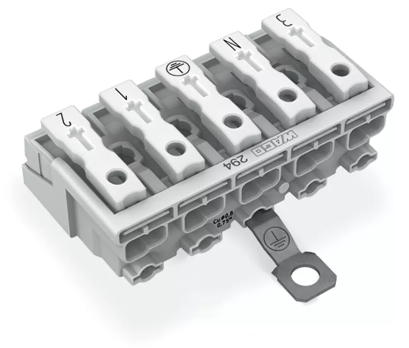 złączka zasilająca; przyciski: od strony zewn.; ze śrubowym stykiem PE; 5-bieg.; od strony oprawy: do przew. jednodr.; od strony inst.: do wsz. rodz. przewodów; maks. 2,5 mm²; temperatura otoczenia maks. 85°C (T85); biały