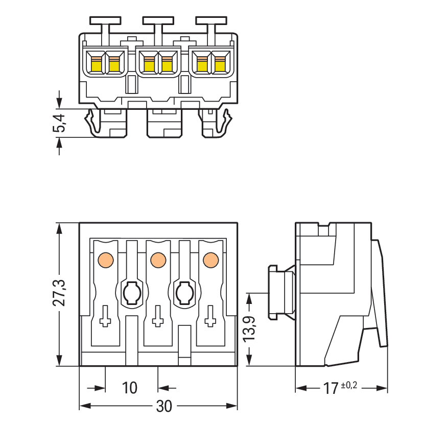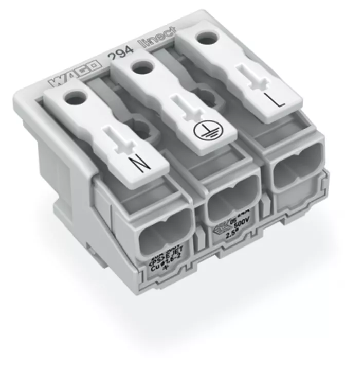 złączka zasilająca; przyciski: od strony zewn.; do Linect®; bez styku PE; 3-bieg.; kodowanie A; od strony oprawy: do przew. jednodr.; od strony inst.: do wsz. rodz. przewodów; maks. 2,5 mm²; temperatura otoczenia maks. 85°C (T85); biały