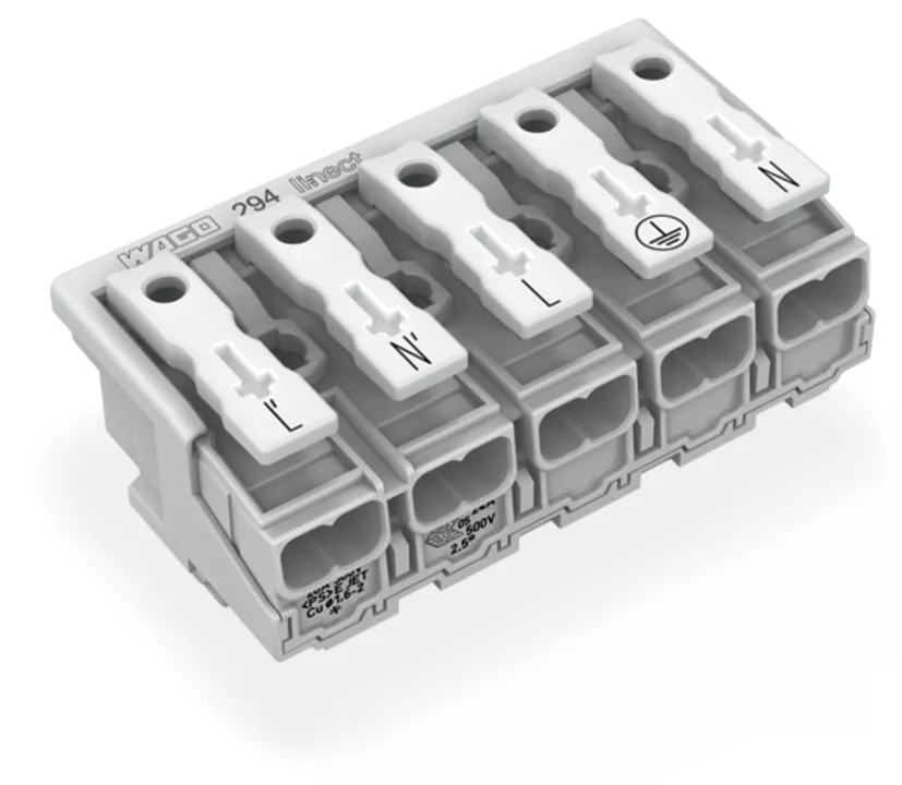 złączka zasilająca; przyciski: od strony zewn.; do Linect®; bez styku PE; L3-L2-L1-PE-N; 5-bieg.; kodowanie A; od strony oprawy: do przew. jednodr.; od strony inst.: do wsz. rodz. przewodów; maks. 2,5 mm²; temperatura otoczenia maks. 85°C (T85); biały