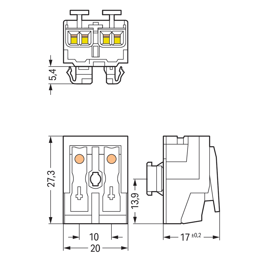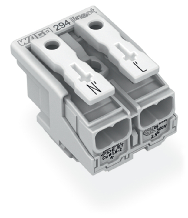 złączka zasilająca; przyciski: od strony zewn.; do Linect®; bez styku PE; N-L; 2-bieg.; kodowanie L; od strony oprawy: do przew. jednodr.; od strony inst.: do wsz. rodz. przewodów; maks. 2,5 mm²; temperatura otoczenia maks. 85°C (T85); biały