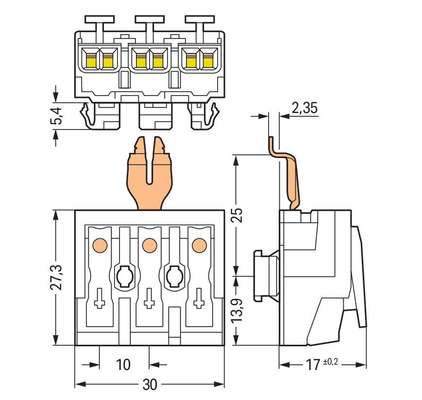 złączka zasilająca; przyciski: od strony zewn.; do Linect®; z kątowym stykiem zatrzaskowym PE; 3-bieg.; kodowanie A; od strony oprawy: do przew. jednodr.; od strony inst.: do wsz. rodz. przewodów; maks. 2,5 mm²; temperatura otoczenia maks. 85°C (T85); biały