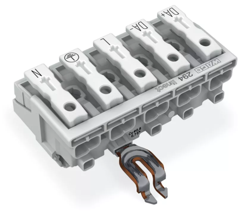 złączka zasilająca; przyciski: od strony zewn.; do Linect®; z kątowym stykiem zatrzaskowym PE; DA+ DA- L PE N; 5-bieg.; kodowanie I; od strony oprawy: do przew. jednodr.; od strony inst.: do wsz. rodz. przewodów; maks. 2,5 mm²; temperatura otoczenia maks. 85°C (T85); biały
