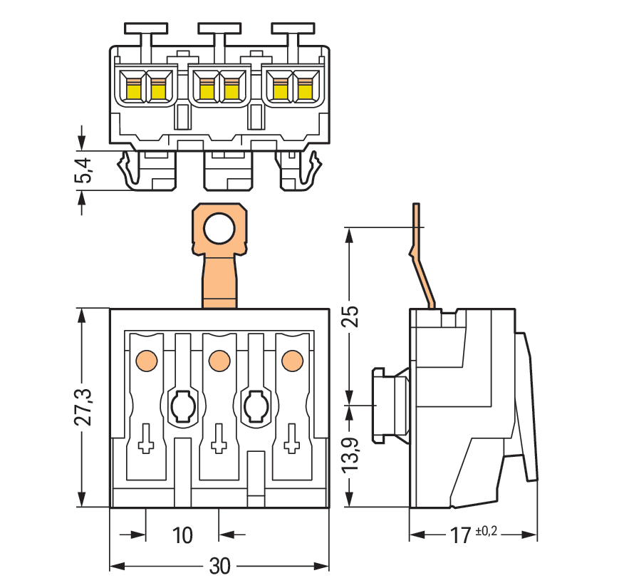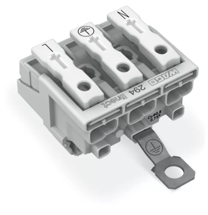 złączka zasilająca; przyciski: od strony zewn.; do Linect®; ze śrubowym stykiem PE; 3-bieg.; kodowanie A; od strony oprawy: do przew. jednodr.; od strony inst.: do wsz. rodz. przewodów; maks. 2,5 mm²; temperatura otoczenia maks. 85°C (T85); biały