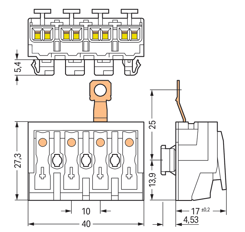 złączka zasilająca; przyciski: od strony zewn.; do Linect®; ze śrubowym stykiem PE; 1/L-2/L-PE-N; 4-bieg.; kodowanie A; od strony oprawy: do przew. jednodr.; od strony inst.: do wsz. rodz. przewodów; maks. 2,5 mm²; temperatura otoczenia maks. 85°C (T85); biały