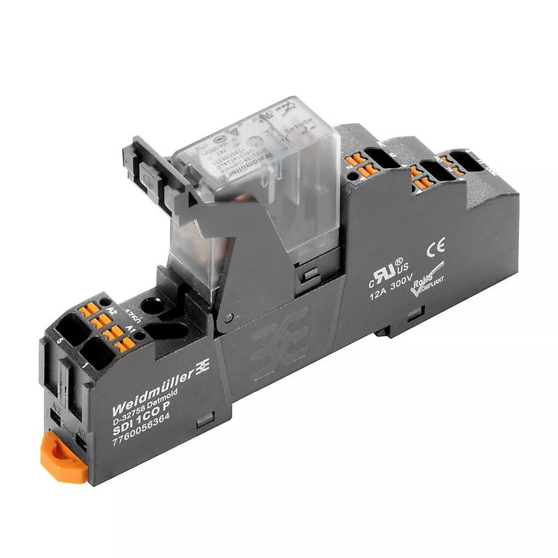 Zastaw przekaźnika wtykowego i złącza żeńskiego. Obwód sterowania i obciążenia wtórnego posiadają izolację elektryczną.