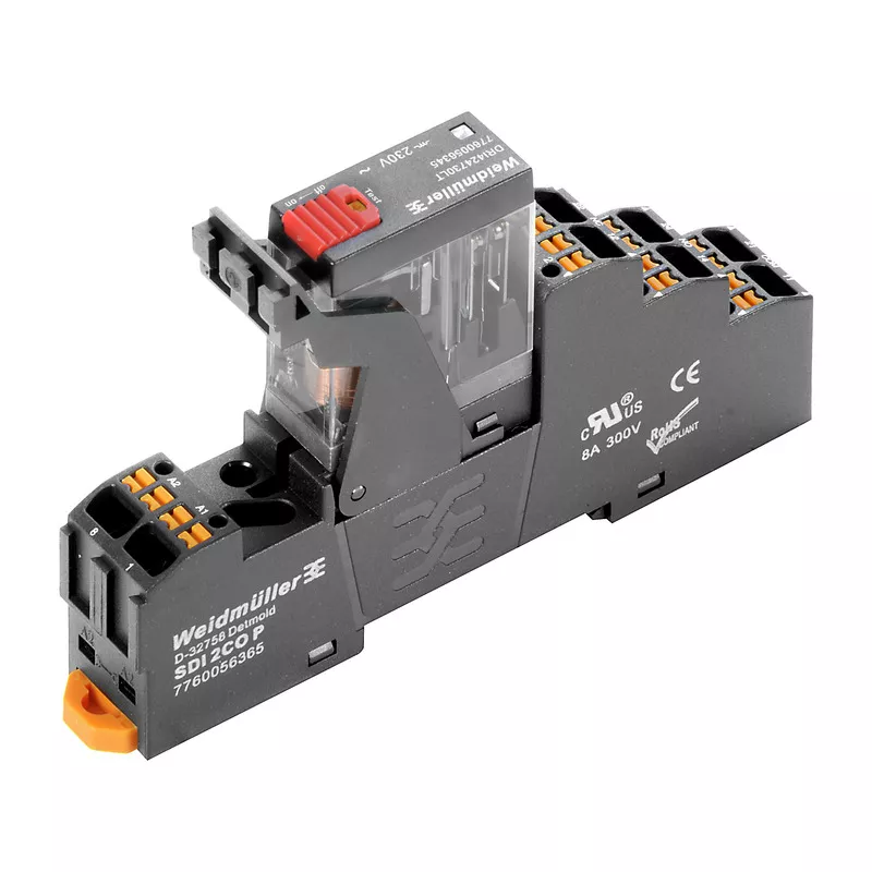 Zastaw przekaźnika wtykowego i złącza żeńskiego. Obwód sterowania i obciążenia wtórnego posiadają izolację elektryczną.
