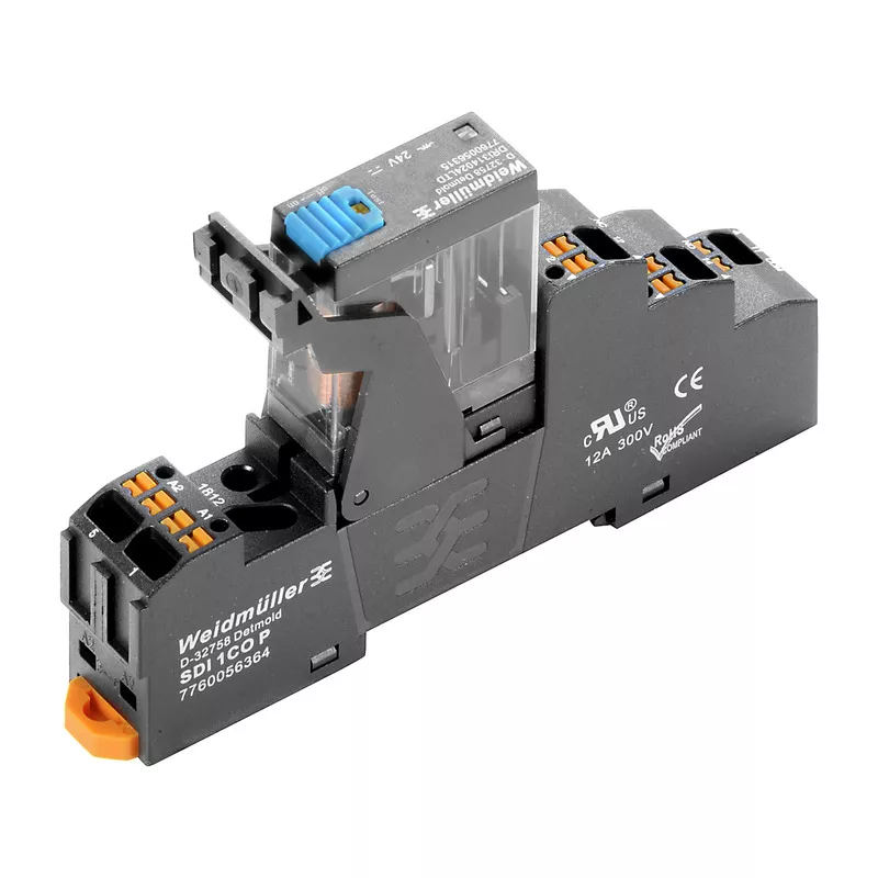 Zastaw przekaźnika wtykowego i złącza żeńskiego. Obwód sterowania i obciążenia wtórnego posiadają izolację elektryczną.