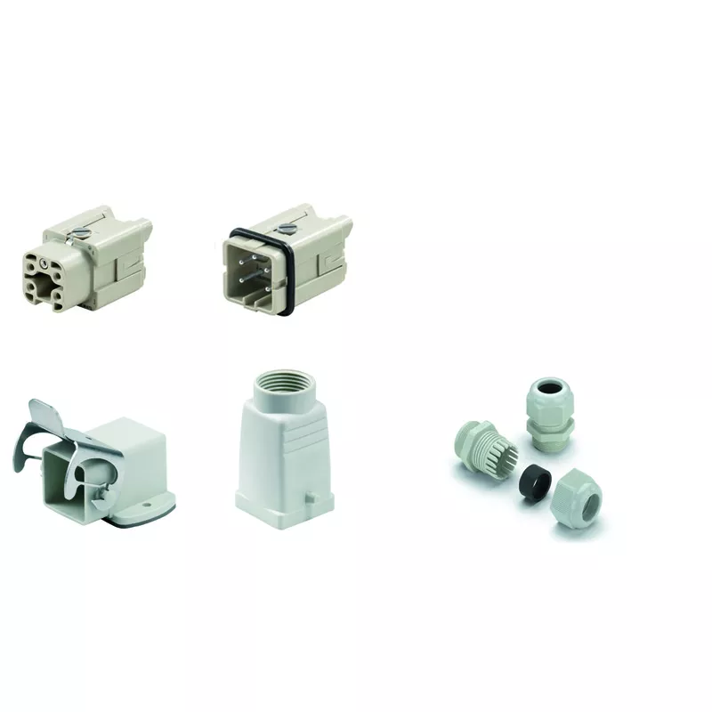 Zestaw wtyczek przemysłowych składających się z wkładek, obudowy i przepusty kablowego.