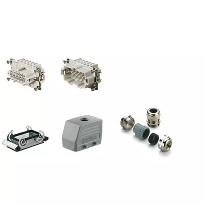Zestaw wtyczek przemysłowych składających się z wkładek, obudowy i przepusty kablowego.