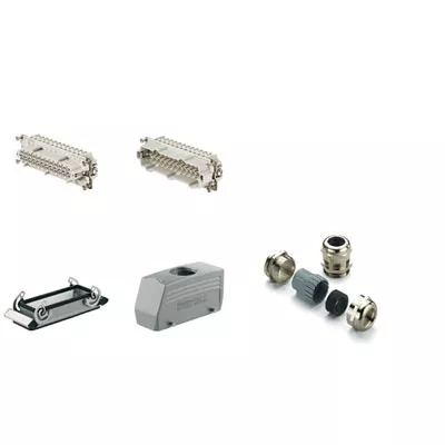 Zestaw wtyczek przemysłowych składających się z wkładek, obudowy i przepusty kablowego.