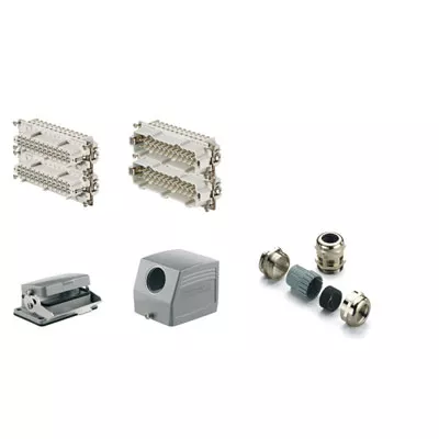 Zestaw wtyczek przemysłowych składających się z wkładek, obudowy i przepusty kablowego.