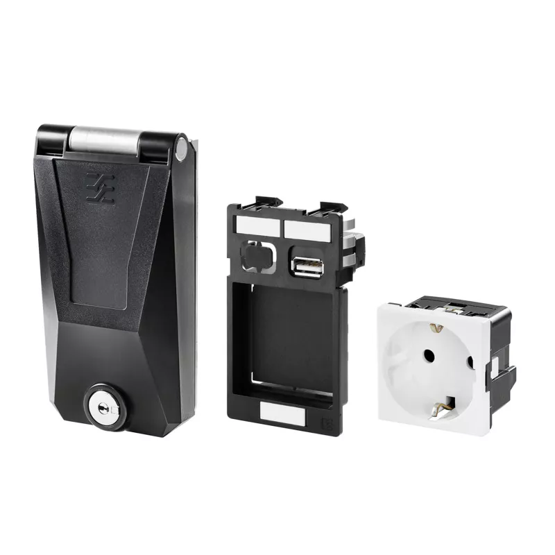 Obudowa komponentu w pojedynczej ramce jest zamocowana za pomocą dwóch różnych wkładek. Podstawowa, łatwa w instalacji obudowa składa się z płytki wkładki z dwoma złączami danych oraz jednym złączem zasilania. Stosuje się albo gniazdo zasilania, albo wkładkę danych usług sieciowych. Kompaktowa obudowa jest odporna na uderzenia i spełnia wymagania klasy ochronności IP 65. Obudowa komponentu może być opcjonalnie wyposażona w kłódkę i klucz.