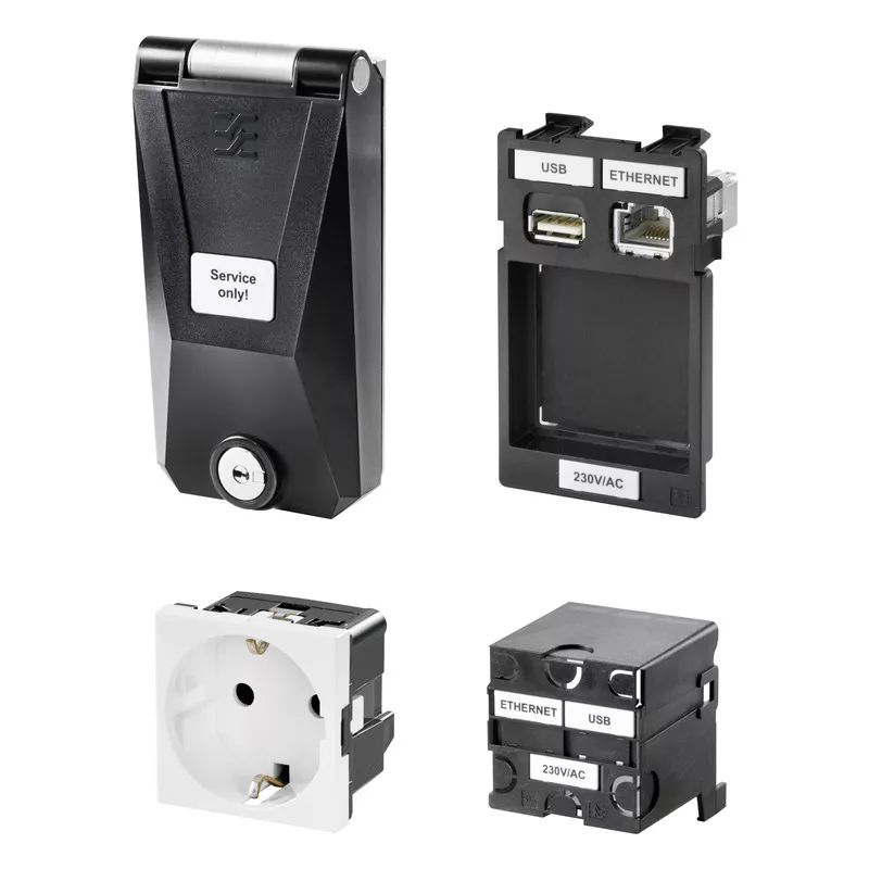 Obudowa komponentu w pojedynczej ramce jest zamocowana za pomocą dwóch różnych wkładek. Podstawowa, łatwa w instalacji obudowa składa się z płytki wkładki z dwoma złączami danych oraz jednym złączem zasilania. Stosuje się albo gniazdo zasilania, albo wkładkę danych usług sieciowych. Kompaktowa obudowa jest odporna na uderzenia i spełnia wymagania klasy ochronności IP 65. Obudowa komponentu może być opcjonalnie wyposażona w kłódkę i klucz.