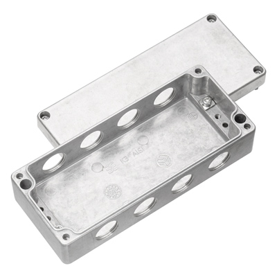 Obudowa metalowa do zastosowań przemysłowych. Otwory mocujące znajdują się poza uszczelnionym obszarem. Montaż ścienny można uzyskać za pomocą otworów montażowych lub nóżek montażowych.