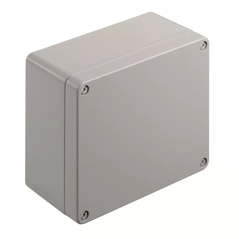 Obudowa metalowa do zastosowań przemysłowych. Otwory mocujące znajdują się poza uszczelnionym obszarem. Montaż ścienny można uzyskać za pomocą otworów montażowych lub nóżek montażowych.